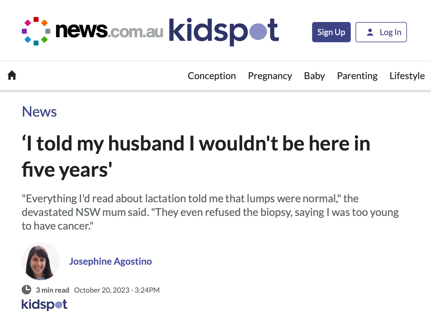 "Everything I'd read about lactation told me that lumps were normal," the devastated NSW mum said. "They even refused the biopsy, saying I was too young to have cancer."